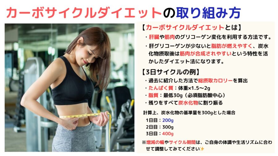 | 3日サイクル | 低炭水化物 → 中炭水化物 → 高炭水化物 | シンプルで続けやすい |
