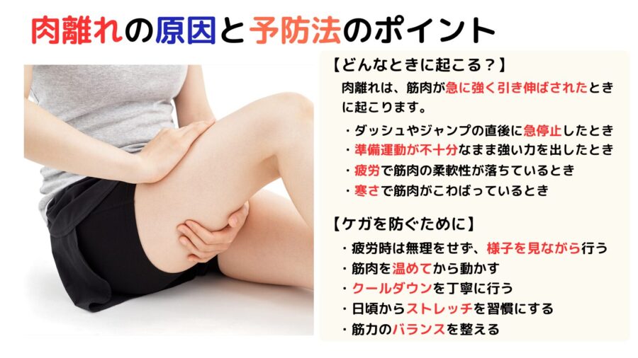 肉離れは、複数の要因が重なったときに発生しやすくなります。一方で、予防につながる行動を意識することで、多くの場合そのリスクを下げることができます。