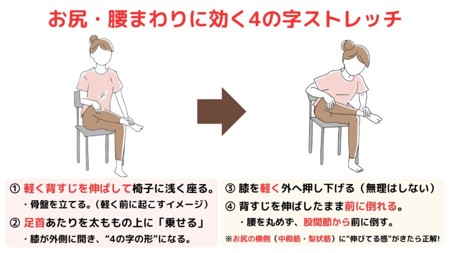 椅子に座ったまま片脚を太ももの上に置き、数字の「4」の形をつくりながらお尻まわりを伸ばすストレッチのことです。股関節の外旋可動域を広げる動きが含まれ、お尻の深層筋(梨状筋・中殿筋など)が伸びると言われています。